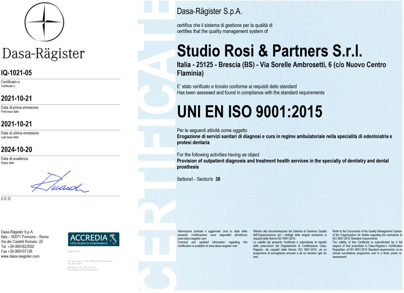 Il 21 ottobre 2021 abbiamo conseguito la Certificazione UNI EN ISO 9001:2015 per l'Erogazione di servizi sanitari di diagnosi e cura in regime ambulatoriale nella specialità di odontoiatria e protesi dentaria.
